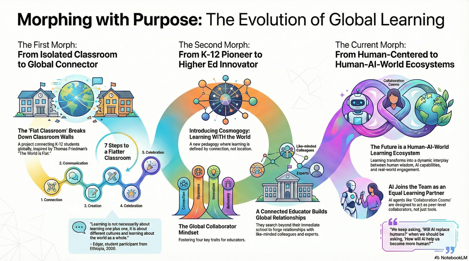 This keynote presentation, titled “Morphing with Purpose,” chronicles the professional evolution of Julie Lindsay from a K-12 music educator to a leader in higher education technology. Her journey is framed through three distinct “morphs” that reflect the changing landscape of global education and technology integration.